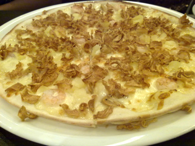Light, crisp flakes of garlic cover the pizza like a blanket of snow, and underneath, the flavors from juicy pineapple slices and plump shrimp blend with the rich, creamy cheese.