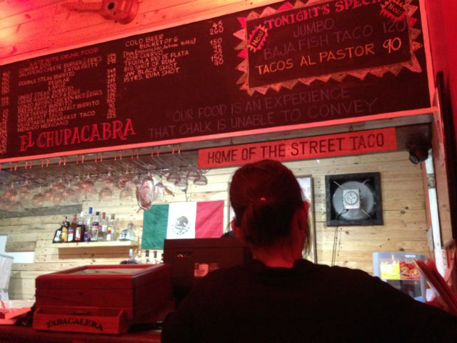 Waiters maneuvered their way in between tables, balancing plates of hot food and buckets of beer. The diners were a mix of partygoers already dressed for a night of dancing, and the fresh-from-the-office crowd with one goal: to eat and drink a lot. At El Chupacabra, both are fairly easy to do. The food is affordable, and the beer is only 45 pesos a bottle. There's also tequila and rum, and a menu of "late nite drunk food" for post-drinking, pre-hangover calorie loading.
