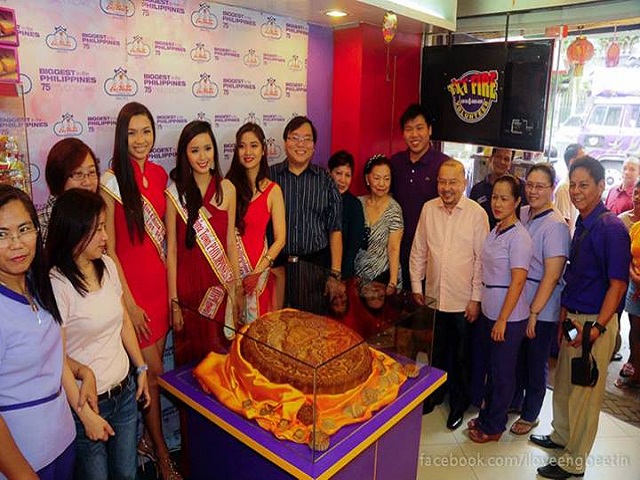 Owners and employees of Eng Bee Tin bakeshop join beauty queens from the Miss Chinatown pageant in unveiling the largest mooncake in the Philippines in August last month in preparation for the Mid-Autumn Festival. Photo taken from Eng Bee Tin's Facebook page.