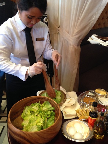 The salad course came next, but it wasn’t just served on the table. Diners get a chance to see how to make a traditional Caesar salad, as servers would enter the dining area with a cart complete with all the ingredients for it. It was fascinating to see someone actually make the salad dressing from scratch, and it only took a few minutes.