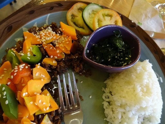 Cafevegis. One of the few veggie restos open until 10:00 p.m., Cafevegis has one of the most varied menus I've ever seen. Best time to go there is during lunch (it closes at 2:00 p.m. and reopens at 5:00 p.m. every day) when they serve “themed” combo meals, from Chinese and Japanese to Thai and Western for P135. A best-seller is the Sinigang, but I've tried most of their dishes and they're all delicious. Take note though that they use mostly gluten here, so make sure you talk to the staff if you don't want any gluten or if you would rather have a soy-based dish. Standard meal price is around P150. They also have good Taro pie with ice cream for dessert (P65)! Plus they also have a mini veggie grocery of frozen and dried veggie products.