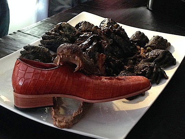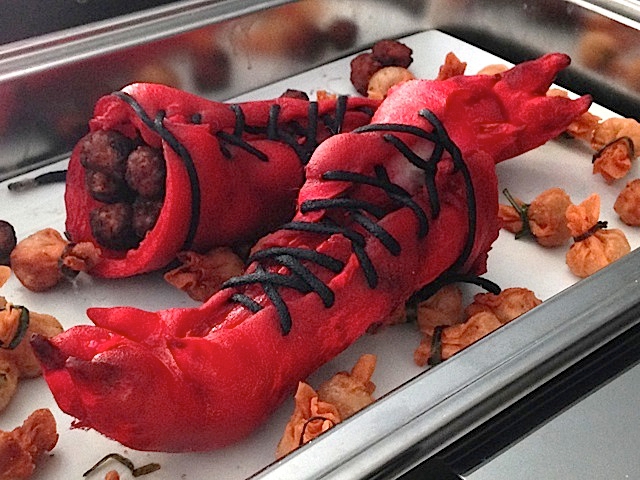 But the most shocking piece was the crocodile paw, which the artists entitled “Anatomy of Love and Hate.” Who wouldn’t be surprised with a crocodile’s maw biting deep into a fine piece of shoe? Chef Dizon deep-fried the croc paws and grilled the croc ribs and used these to violently frame Tenorio’s shoe piece called “Designing the Asshole,” which uses the least commercially used part of crocodile leather. According to the description of the piece, “The shoe design is a homage to Tenorio’s fiercest but fondest memories of someone (or several).”