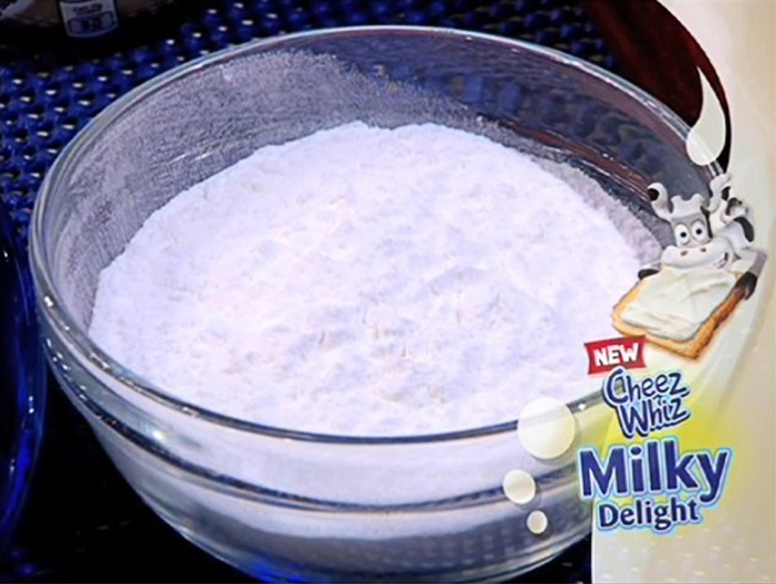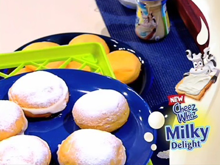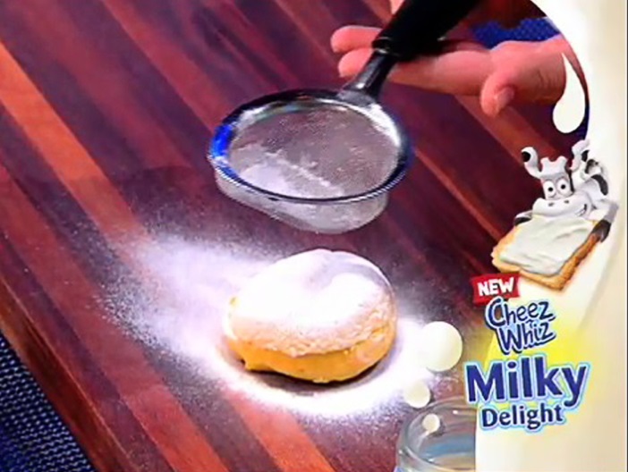 Take your regular everyday plain donut, for example—you know, the kind without a hole in the middle? You can buy these in your local neighborhood bakery or grocery. Now, poke a hole in the middle, but don't go all the way through the donut! Then, if you have a pastry bag on hand (or if not, just take some baking paper or wax paper, roll it into a cone, and then cut off the tip) spoon a large dollop of Cheez Whiz Milky Delight into the bag and squeeze it all right into that hole. When the hole is filled, spread the excess a bit on top of the donut, then you can sprinkle some sugar on top and there's your Milky Delight donut for your Milky Delight kid!