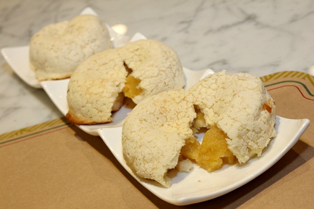 The better starter is actually the Crispy Barbecue Pork Snow Buns. Same light and crumbly crust as the pineapple buns, only with Chinese-style barbecued pork filling.