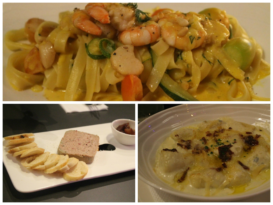 Counter-clockwise from left: Shrimp & Scallop Tagliatelle, Chef's Pate, and Gnocchi.