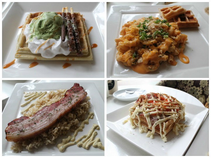 Clockwise from upper left: Double Green Tea Waffle, Truffled Mac & Cheese, Big Bang Waffle, Bacon Slab