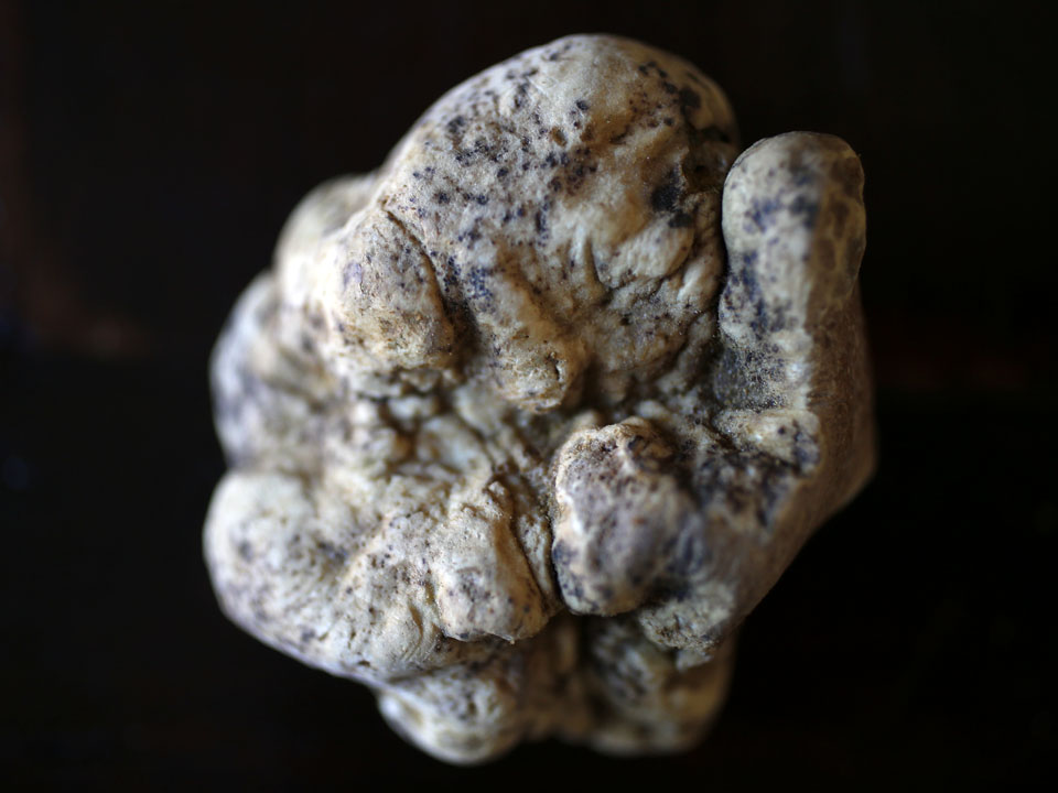 A truffle is seen on a table in Alba, north-western Italy November 11, 2013. Located in the heart of the Langhe - the hilly southern area of Italy's northwestern Piedmont region - Alba is the country's capital of white truffles, a variety of the prized fungus which grows underground. Truffles are found two to eight inches (5-20cm) below the ground near the roots of trees. They give off an odour which lasts for a limited period of time and can be detected with the assistance of well-trained dogs and experienced hunters. Output of white truffles, which are not cultivated and only grow naturally in forests, has fallen in Italy over the past few years, largely because climate change has brought a damaging mix of drought and torrential rains. Picture taken November 11, 2013. REUTERS/Stefano Rellandini