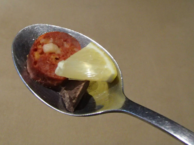 Try pairing chocolate with cheese or meat. Here, a chunk of Malagos chocolate is combined with chorizo and slice of lemon.