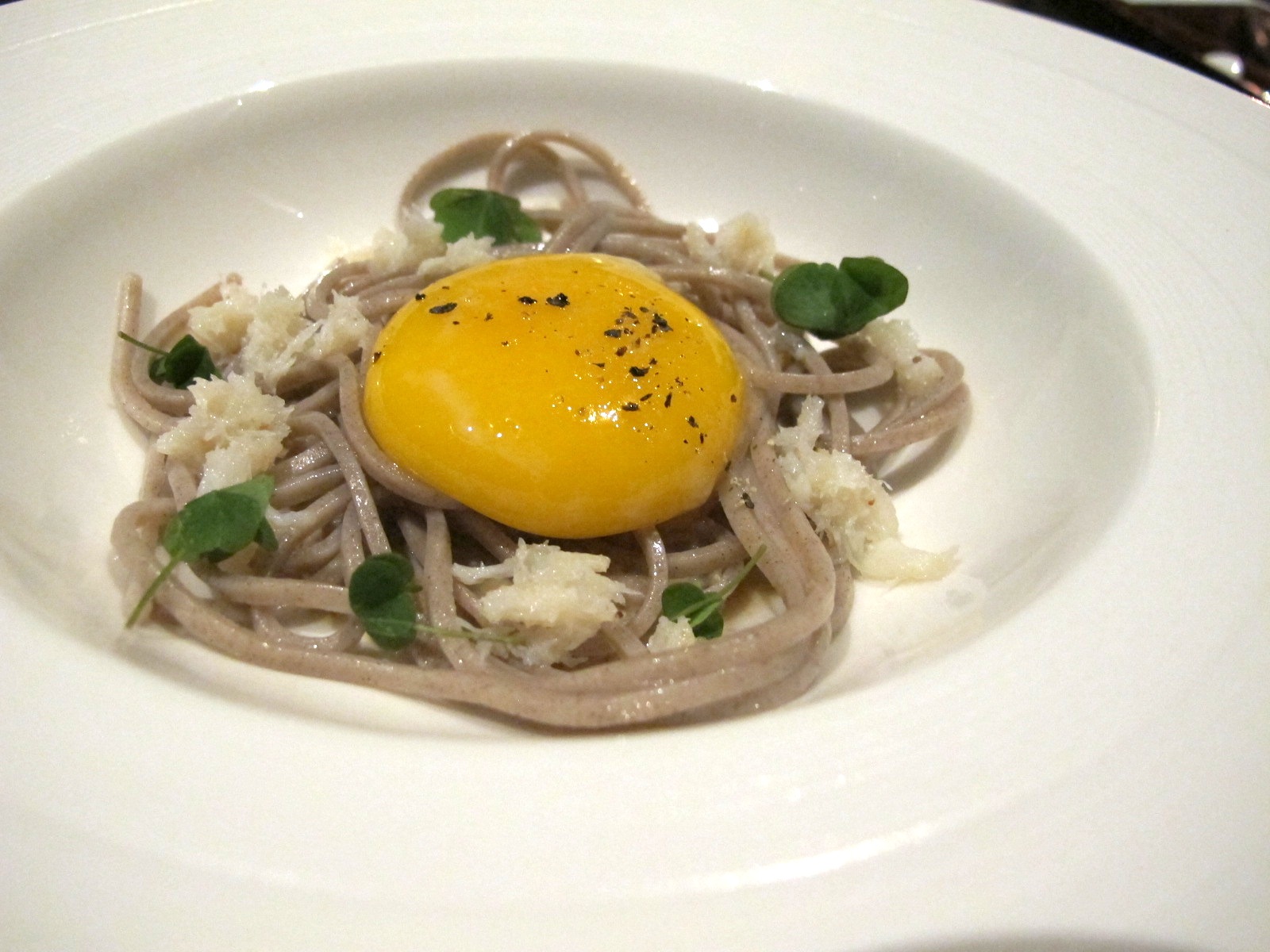 Soba with sea urchin cream, crab and 63-degree egg yolk