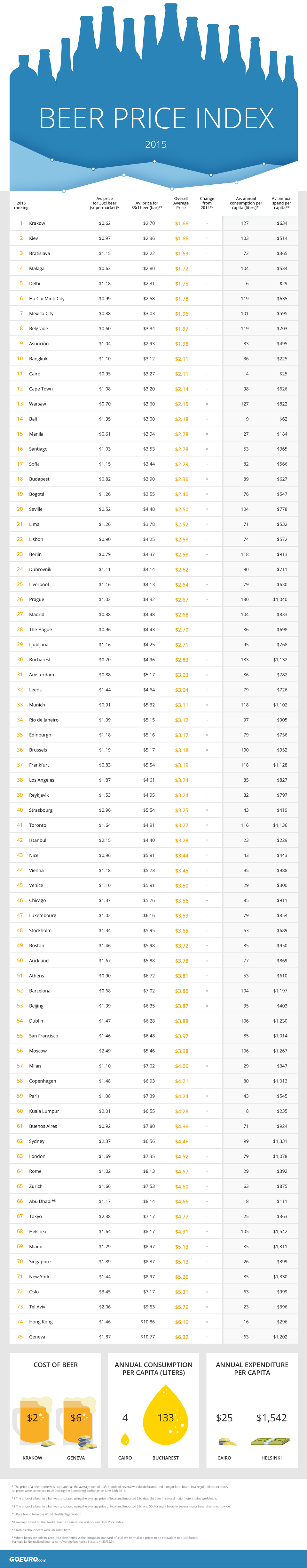 GoEuro, a website that compares bus, train and flight prices across Europe, compares the prices of beers in stores and bars in 75 world cities on its 2015 Beer Price Index.