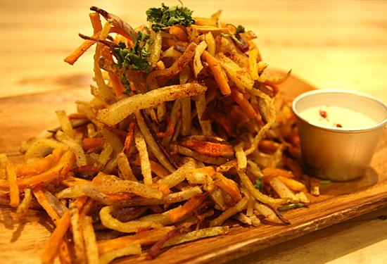 This heap of hand-cut potatoes, sweet potatoes, and carrots with sour cream dip is a labor of love (of good food). Each fry is thin enough for that crunchy texture and thick enough to be savory.