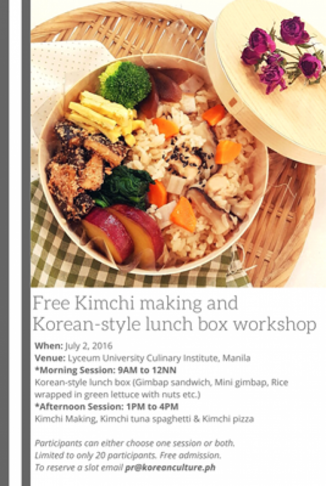The Korean Cultural Center in the Philippines has partnered with Lyceum Philippines University Culinary Institute to hold a free Kimchi making and Korean-style lunch box workshop on July 2.