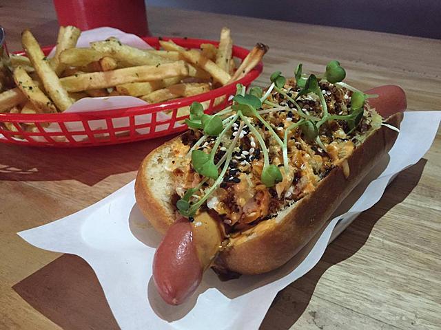 Along with the regular bun and sausage comes wasabi mayo, tempura crumbs, and furikake. The flavor borders on sweet, but it's the crunchy texture that makes this hot dog sandwich a winner. But the, ahem, wiener itself has a great snappiness to it.