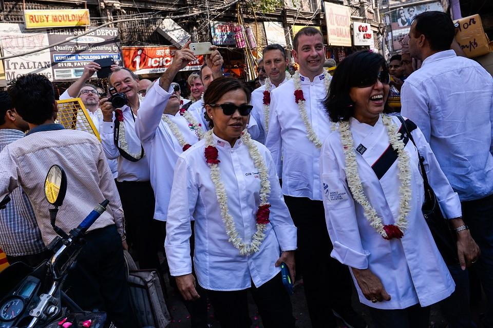 Arriving in their immaculate chef's whites at Old Delhi's chaotic spice market, even more crowded than usual ahead of the Diwali festival, they were showered with pink rose petals and garlanded with jasmine.