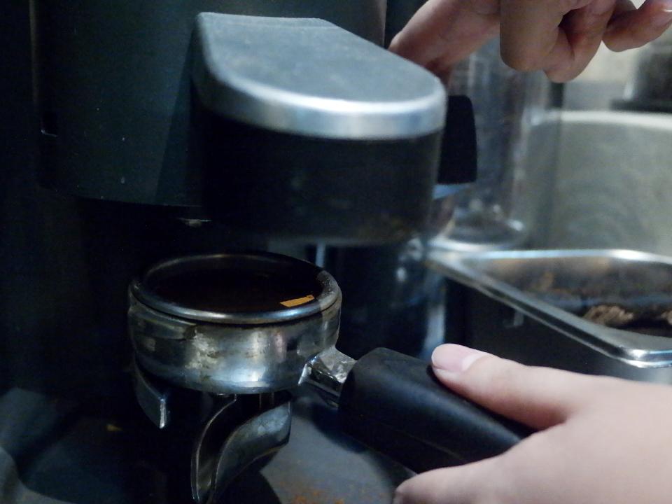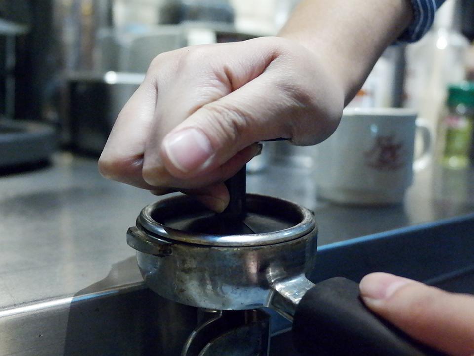 Step 2: Tamp the grounds to flatten the beans inside the portahandle to pack the grounds evenly.