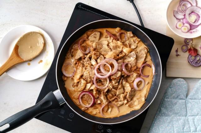 4. Transfer Creamy Pork Steak on a serving plate, top with sautéed onions, and serve.