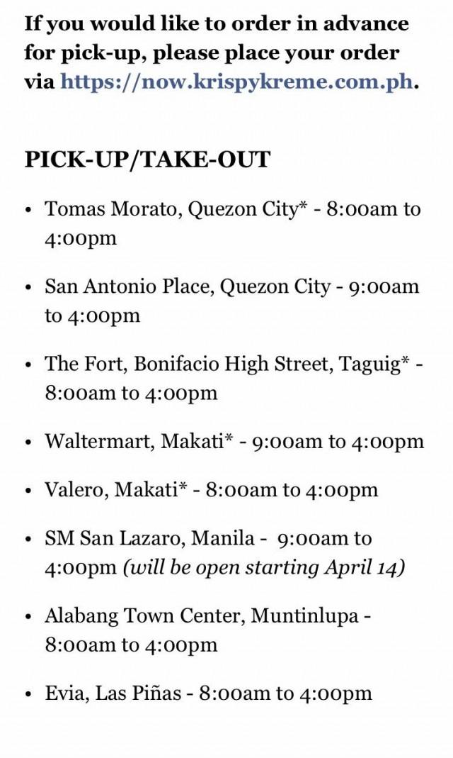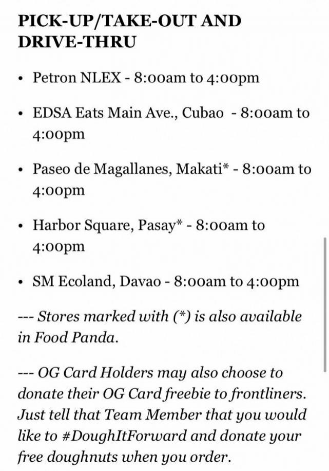 The donut chains reopened their doors for pick-up and delivery orders in select branches, as announced on their social media pages.