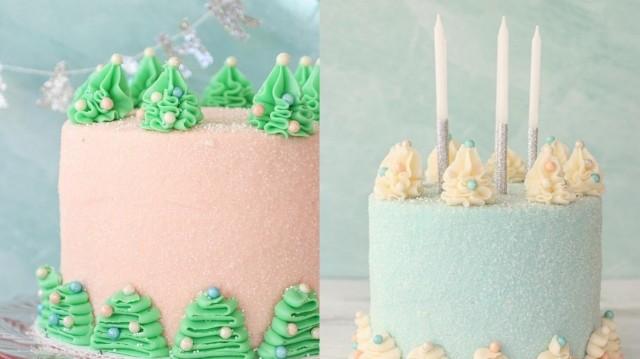 The Bottle Brush Tree Cake comes either as vanilla or chocolate coated in pastel blue or pastel pink buttercream complete with white sanding sugar around it.