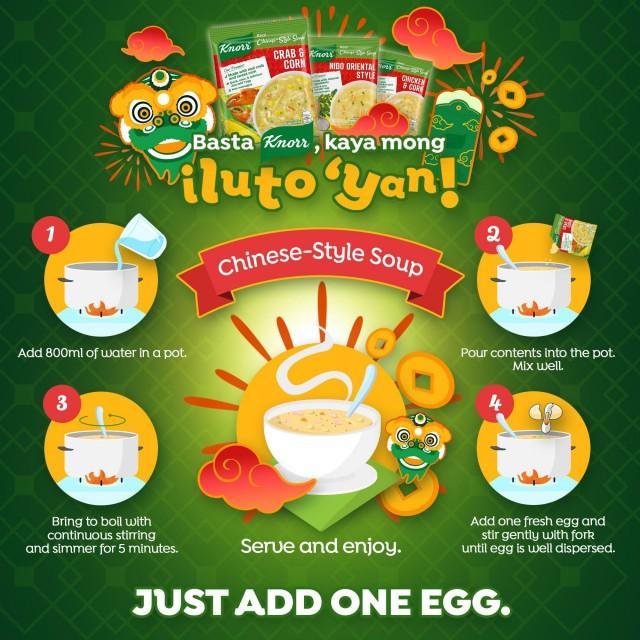 Knorr Crab and Corn, Nido Oriental Style, and Chicken and Corn Soups are so convenient that we can’t forget that ever popular step that illustrates how easy they are to cook – JUST ADD ONE EGG!