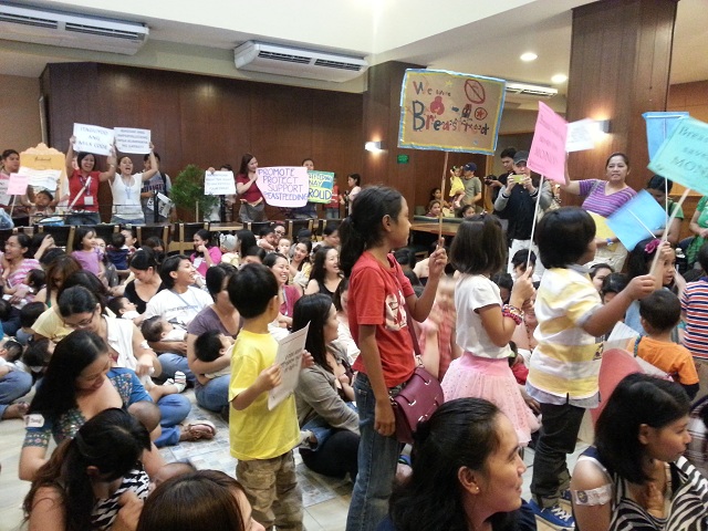 At the Manila event, moms sat on the floor of the restaurant to breastfeed their babies as supporters held up signs calling for more support for the practice of breastfeeding and for the Milk Code, which promotes breastfeeding and regulates the marketing of breast milk substitutes and supplements.
