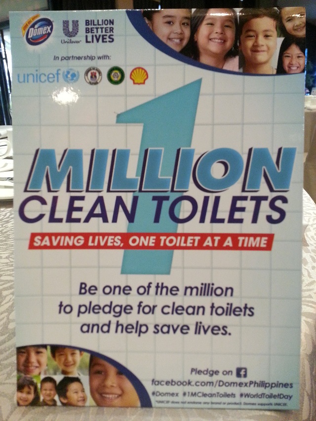 Apart from regularly cleaning toilets in the proper manner, other ways an ordinary person can help include logging onto Facebook and clicking the PLEDGE button. Domex will give P5 to UNICEF's sanitation program for every pledge made.