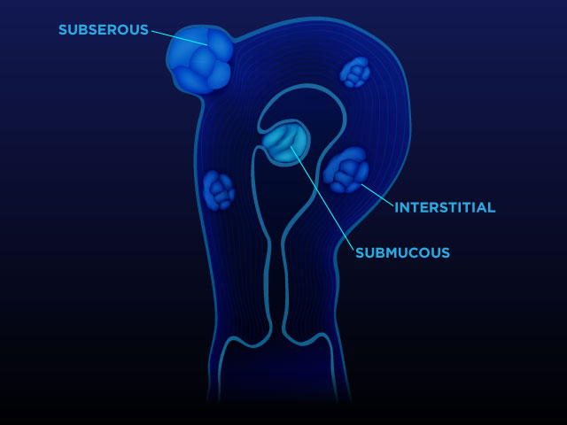 Myomas are benign, solid tumors growing out from the muscular layer of the uterus. These could grow out into the surface of the uterus (subserous type), or simply stay within the muscular layer (interstitial or intramuscular), or grow into the uterine cavity (submucous). Some have stalks (pedunculated). All of these will make the uterus, essentially a muscular organ, grow larger, usually with an irregular shape.