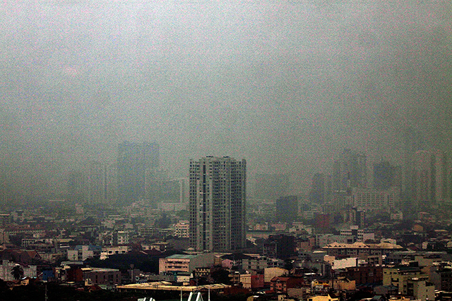 Thick smog stemming from pollution blocks sunlight at the Makati City skyline on September 26, 2014. Danny Pata