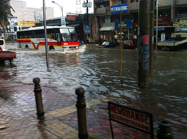 A passenger bus makes its way through the flooded Timog Avenue in Quezon City following an afternoon thunderstorm on October 7, 2014. Michael Fajatin