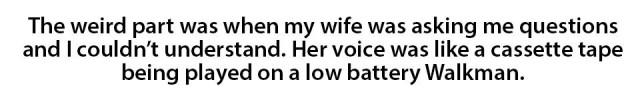 Then everything darkened. It was as if someone dialed the dimmer switch all the way down. My eyes strained to focus and thoughts became muddled in my brain. The weird part was when my wife was asking me questions and I couldn’t understand. Her voice was like a cassette tape being played on a low battery Walkman.