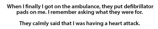 They couldn’t carry me to the stretcher because the pain in my knee was still paramount to anything else and I had to use my crutches to get on it. When I finally I got on the ambulance, they put defibrillator pads on me. I remember asking what they were for.