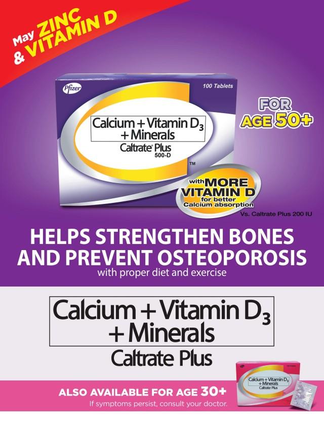 To get the recommended daily dose of Vitamin D needs, supplement with a vitamin like Calcium + Vitamin D3 + Minerals (Caltrate Plus 500-D). Calcium + Vitamin D3 + Minerals (Caltrate Plus 500-D) is also a good source of Vitamin D that can fill the body’s nutritional gap. Each tablet is packed with Vitamin D that can help strengthen the immune system with healthy diet, enough sleep and regular exercise.