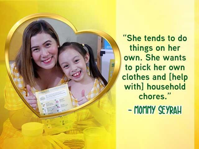 The right amounts of DHA, Iron, Zinc, Folic Acid, B-Vitamins, and Calcium help keep toddlers mentally alert. Brain-boosting activities also support cognitive abilities. “I let my daughter play puzzles, word search games, memory games, and also practice reading and writing to enhance her vocabulary too,” Yce enumerates. Meanwhile, mommy Seyrah also believes that being mentally alert builds independent kids, like her daughter Cady. “She tends to do things on her own,” she says. "She wants to pick her own clothes and [help with] household chores.”