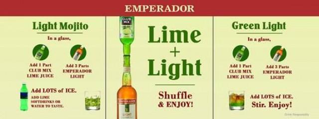 Line up the mouths of an Emperador bottle and a bottle of Club mix lime juice and turn it upside down several times. Pour over ice or enjoy with clear soda.