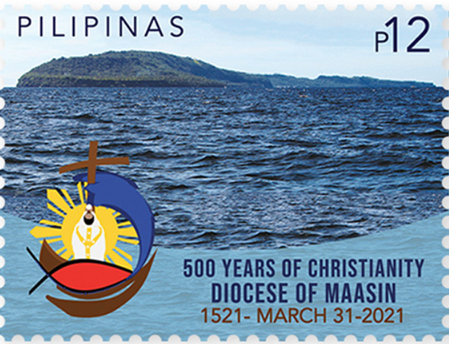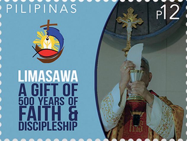 The stamps show a photo of Limasawa island and another one is that of a priest holding up a communion host and chalice that has the inscription “Limasawa – A Gift of 500 Years of Faith & Discipleship.”