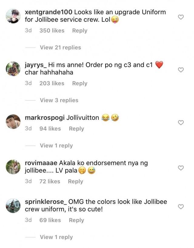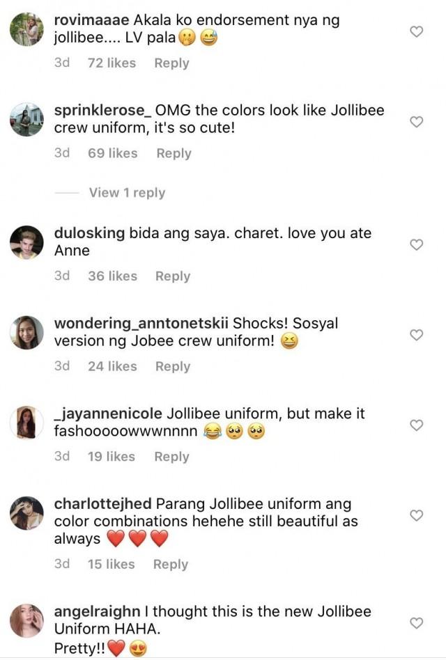 Unsmiling with a faraway look, Anne looked incredibly fierce. In the comments section however, fun-loving netizens simply had to voice out how Anne's OOTD has the same colors and feel with Jollibee's service crew uniform.