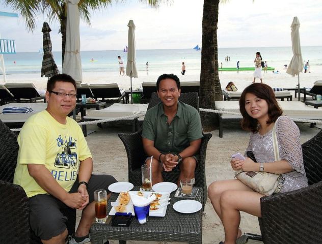 Resort manager Leeds Trompeta (center) entertains guests at the famous Boracay beach front. Courtesy of Discovery Shores.