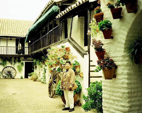 Afterwards, Alex and I found the energy to simply walk around the narrow streets and witness for ourselves the pride of the citizens in their open-air courtyards, some with fountains and orange and lime trees bearing colorful citrus fruits. Along the Calleja de Flores we lingered behind iron grills leading to patios with gardenias, roses, daisies, carnations, and other blooms I couldn’t identify, but no less colorful and showy. They were mostly in terra cotta pots arranged artistically on the garden floor, although some houses anchored these pots on the walls, so that splashes of colors were seen starkly against the white walls. In other houses, ferns and other plants were also grown in different-sized jars. In one particular house with a flower-filled patio, soft guitar music could be heard. Alex and I smiled and lingered as we discerned a gentle rendition of our favorite Romanza melody, popularized in the French movie Jeux Interdits (Forbidden Games). Alex used to play the classic guitar, and this was one of the pieces that he aspired to learn.