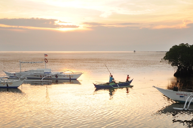 Father and son head home after a day's fishing, taken near the mangrove-lined pier of Panglao.