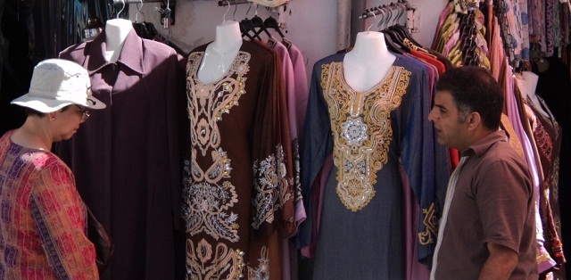 Gina looked for embroidered tablecloths in another shop, and we were shown so many variations in varied hues, some of which even had gold and silver threads running through them. Another shop sold dresses which were very modest, long-sleeved and floor-length, like loose robes. Some had fully-beaded bodices, almost like evening gowns, and in all colors imaginable.