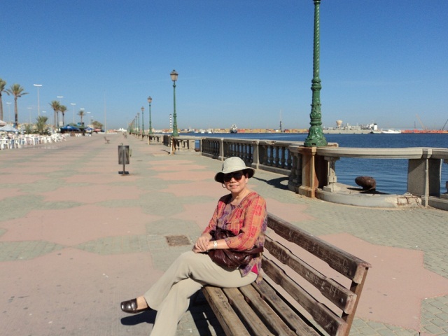 Good friend Al suggested that we start our city adventure along the boulevard, near the harbor. So one morning Alex and I, together with Al’s private staff Gina who was to be our guide, were dropped off at the esplanade by the sea, lined by tall, green lampposts reminiscent of Old Europe. It was a wide and long concrete walk beside turquoise waters, and from time to time seagulls cried out and swooped low. Various freighters slowly wound their way to and from the port nearby, a sign of active trade in the city. There were long benches too, that allowed promenaders to sit awhile. The breeze from the ocean was brisk and warm as we slowly traversed the pathway, shielded from the sheer drop into the sea by a low wall. In my journal I wrote: “At last, another glimpse of the Mediterranean, this time from North Africa!” Somehow it took some time for the thought to sink in: that we were really in Libya!