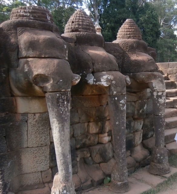 My husband Alex and I were in Siem Reap, Cambodia – in the area of Angkor Thom, with our kind tuktuk driver Po Lit. We were traveling along the quiet countryside, when Po suddenly stopped and pointed to a grassy area not far off. At first we could only see a raised stone platform, with tall columns guarding the gray walls. We got out of the vehicle and slowly walked towards some structures that looked like ruins. The long columns turned out to be elephant trunks, and the pachyderms were standing in a row, as if guarding the stone staircase leading to the upper terrace.
