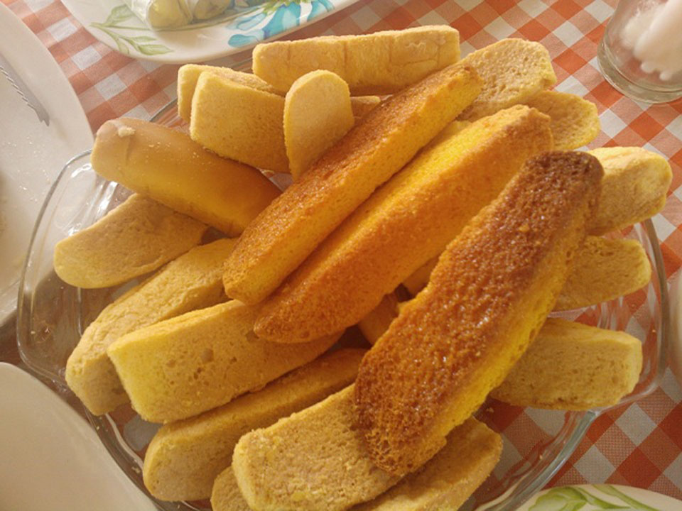 Bischocho is "twice baked" bread topped with butter and sugar, perfect with coffee or hot chocolate.