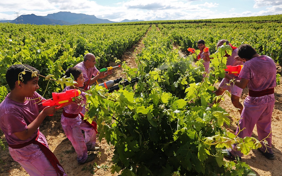 Revelers use toy guns to spray wine on each other as they take part in "La batalla del vino de Haro" during the Haro Wine Festival in Haro in the northern province of La Rioja on June 29, 2014. More than 9,000 locals and tourists threw around 130,000 litres of wine at each other during the festival, according to local media. Located far from the beaches that bring millions of tourists to Spain each year, La Rioja has sought over the past decade to draw visitors to its numerous wineries, many featuring stunning contemporary architecture. AFP PHOTO/Cesar Manso