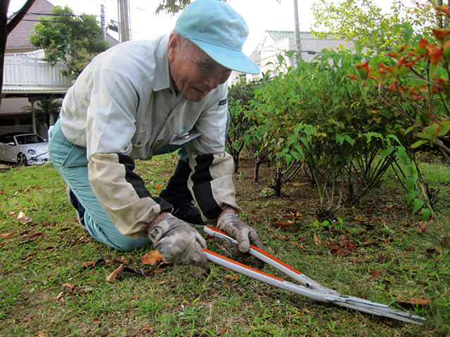 An elderly member of the Silver Jinzai Center does gardening work at the Daisen Park in Sakai City.