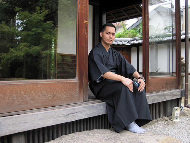 The author enjoying the cold autumn breeze while sitting on the porch of the garden of the Yamaguchi residence at Sakai City, Japan.