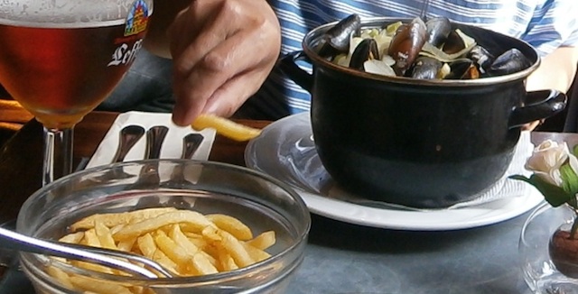 Now almost 20 years later, we agreed to sit down to another moule-frite lunch, this time accompanied by a walnut, peach and lettuce salad, and a 500 ml. cold Leffe beer for Alex. Again, we were not disappointed. The mussels were fresh, plump, and very sweet. Cooked just right to bring out its briny juices, with hints of garlic, onions, parsley, chili, thyme, cloves and white wine, each piece was a gustatory delight. We ate them slowly, from time to time looking out from the latticed window where the soft sunlight shone through. Out in the sunny street, horse-drawn carriages passed by, the click-clack of horse’s hooves making syncopated music on the cobblestones.