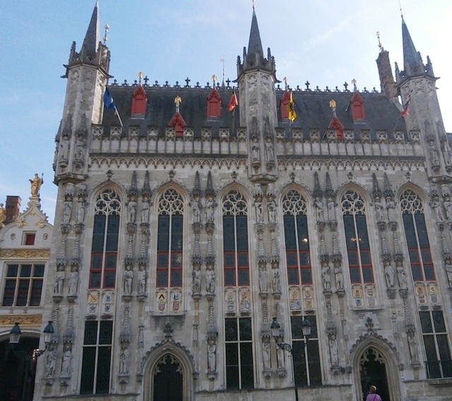 Just off to one corner was a brown building with Gothic windows and an embellished façade. Gold statues adorned the spaces between the glass windows. This was the Basilica of the Holy Blood. Inside the church was a relic, a vial of blood said to be that of Jesus Christ, brought to Bruges by a Holy Crusader, Thierry of Alsace, from Jerusalem during the Middle Ages. Every year during its feast day, this relic is brought out in a procession around town. Devotees join the well-attended religious rite, dressed as medieval knights or crusaders. Underground was a Romanesque chapel, a bit gloomy and sad.