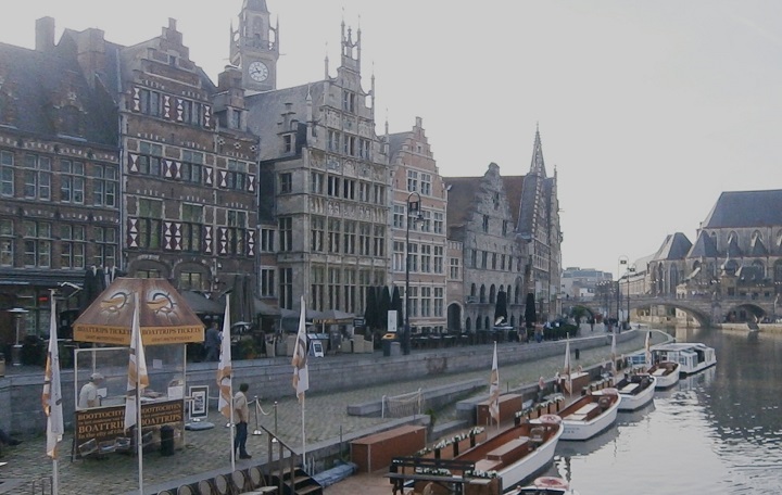 The one to its left, also lined by beautiful and evocative houses, was the Korenlei. During the Middle Ages, when Ghent was one of richest and most powerful cities in Europe, merchants constructed beautiful houses along the canals. There were also buildings to house grains, like corn and wheat, and precious herbs. These traders’ guilds exerted much influence over the lives of the people, as they controlled the economy. Many of the houses were restored and rebuilt for the 1913 Expo, but one could not point out which was “new” and which was old. The stepladder gables, the pointed pinnacles, the amber and red-hued façades: they were all breathtaking as the sun slowly rose above us.