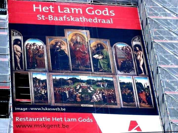 Inside was its major attraction, the Ghent altarpiece, an 11-foot x 15-foot polychromatic tryptic panel painting with hinges named “The Adoration of the Mystic Lamb” done by Hubert and Jan Van Eyck during the 15th century. The front views were colorful renditions of Jesus as Christ the King in the center, flanked by the Blessed Virgin and John the Baptist.