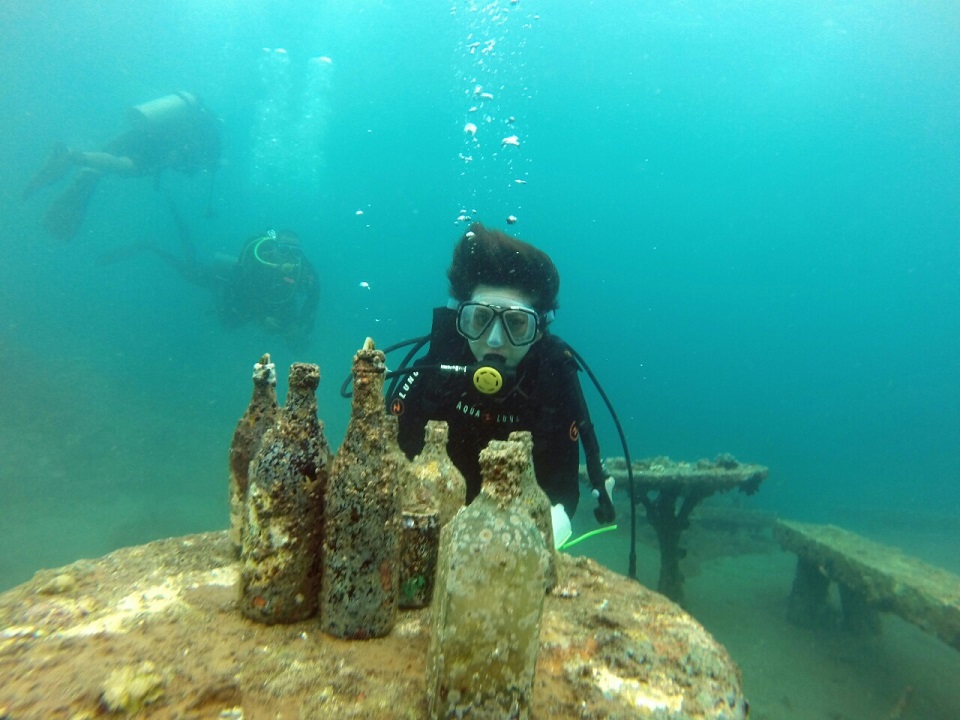 Me and a couple of fishy drinking buddies poking their heads out of beer bottles at the Steps dive site
